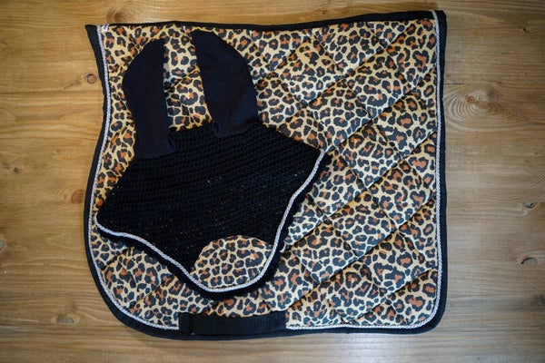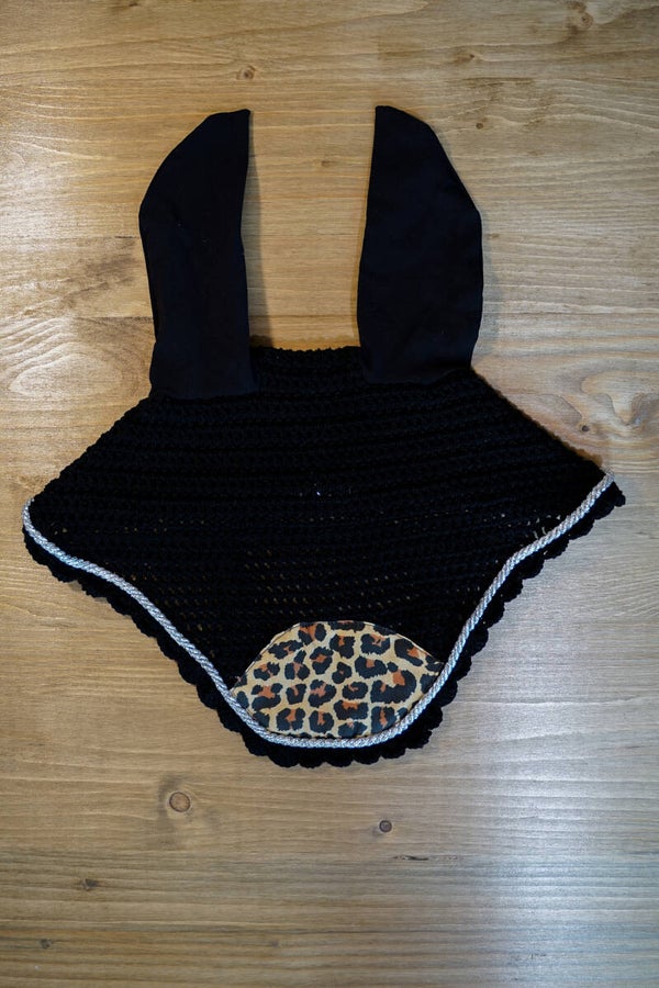 Sottosella leopardato con bordo nero e cordoncino argento, interno in nido d'ape traspirante. Cuffietta corta nera con cordoncino argento e patch leopardata. Orecchie elasticizzate.