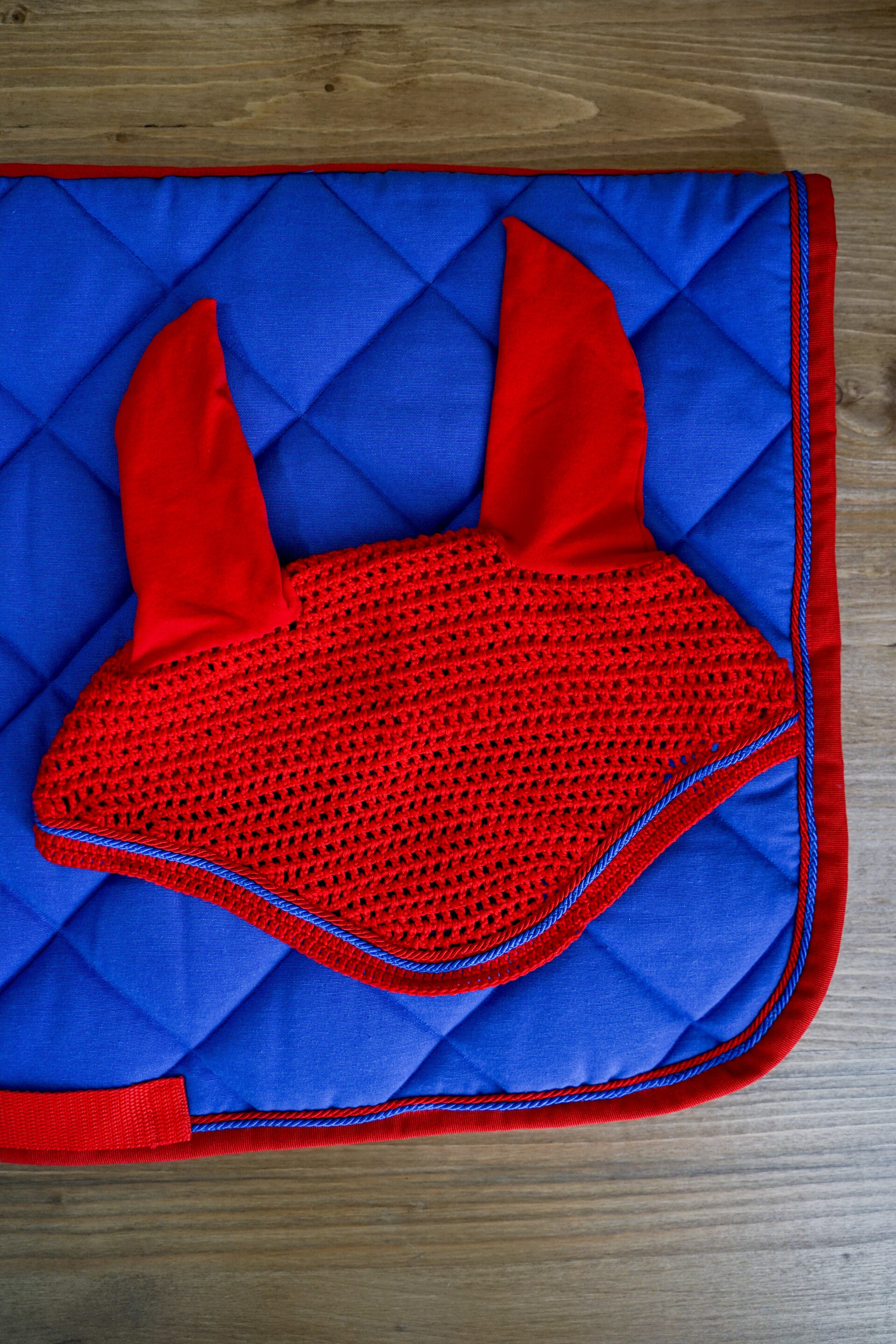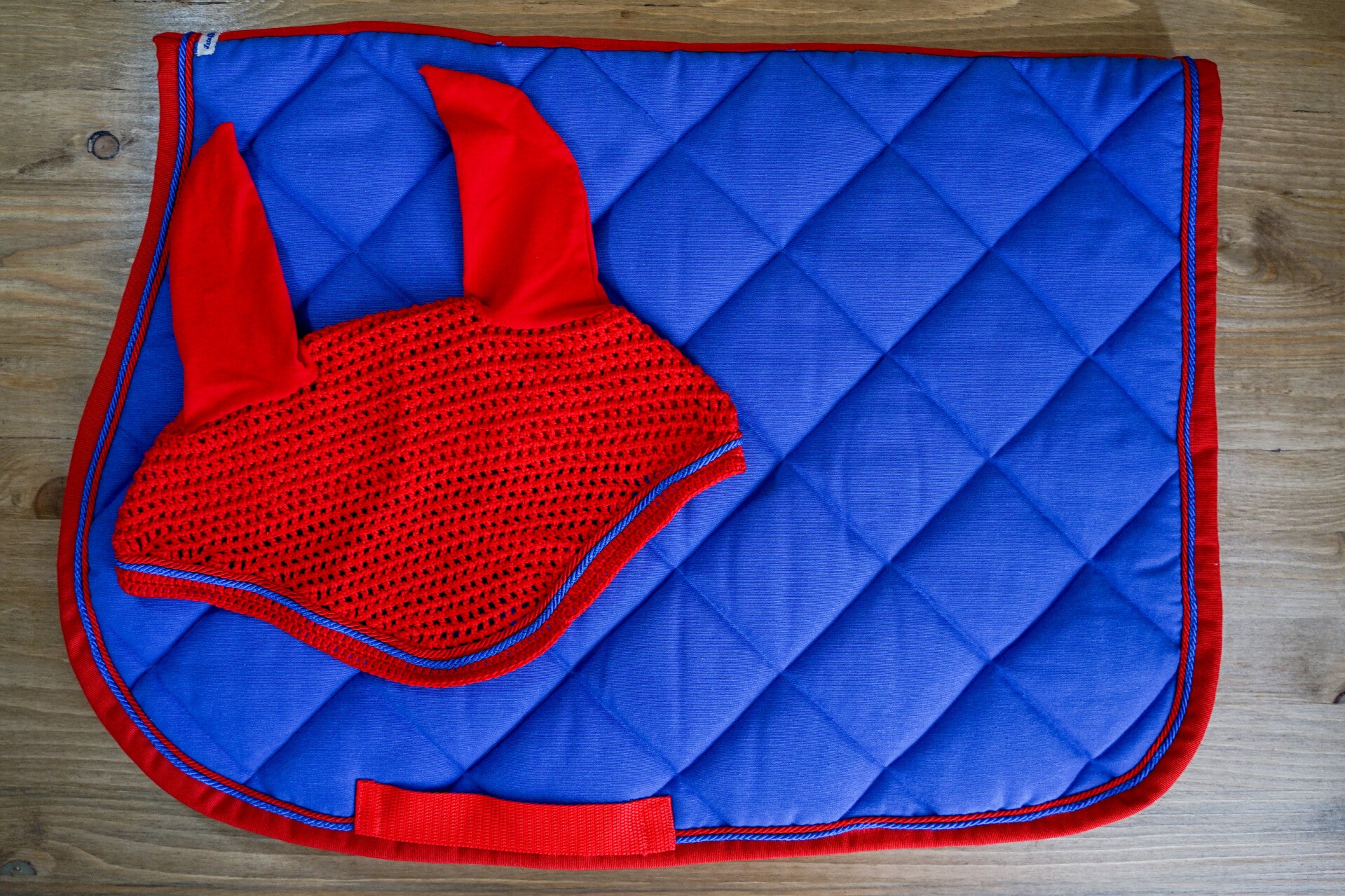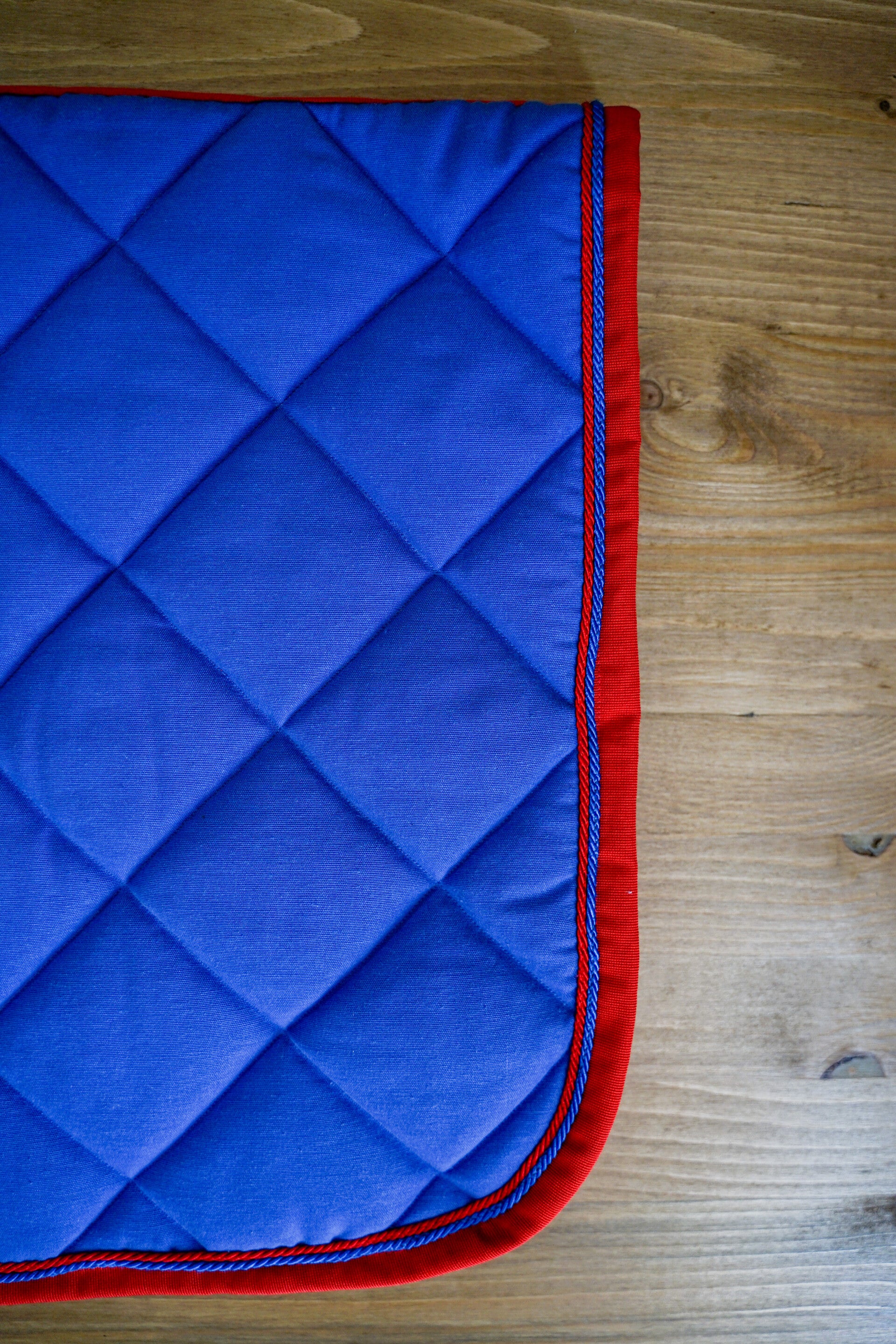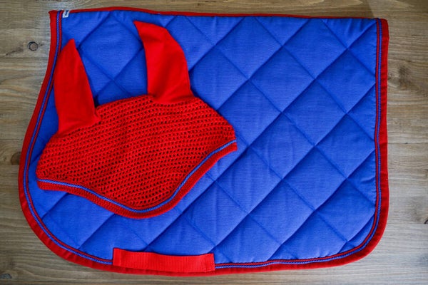 Sottosella blu avio con bordo rosso e doppio cordoncino: blu e rosso. Interno in nido d'ape traspirante.