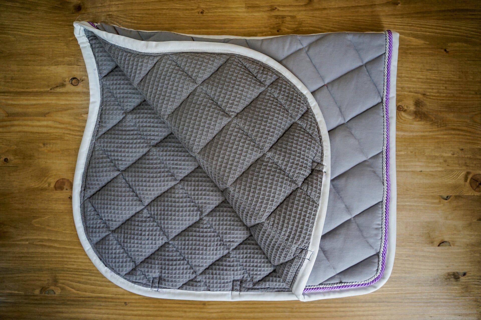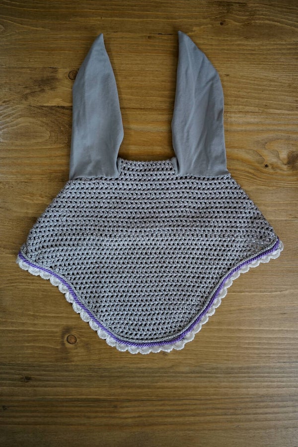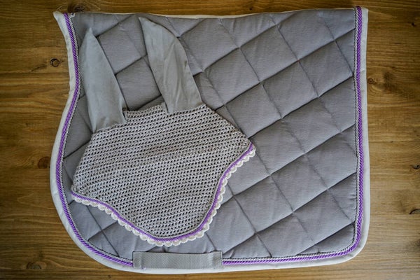 Sottosella e cuffietta corta grigio chiaro con bordo bianco e doppio cordoncino: lilla e argento. Interno in nido d'ape traspirante. Orecchie elasticizzate.