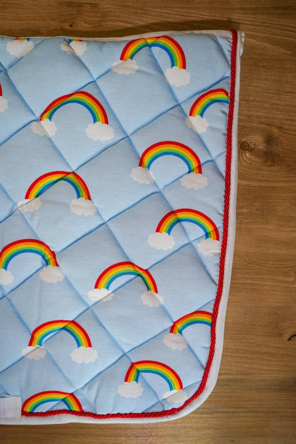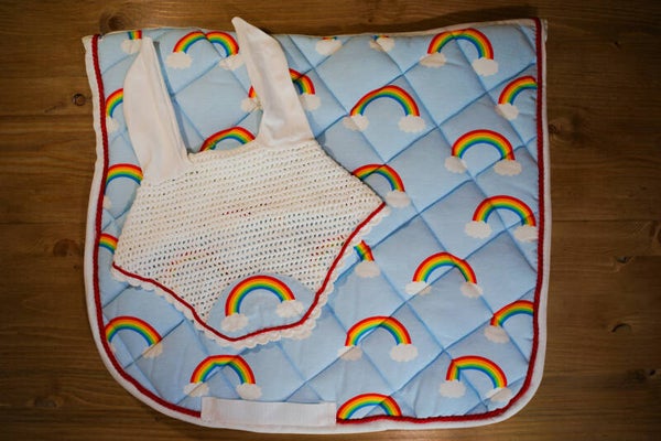 Sottosella fantasia con bordo bianco e cordoncino rosso e cuffietta corta bianca con cordoncino rosso e patch arcobaleno. Interno in nido d'ape traspirante. Orecchie elasticizzate.