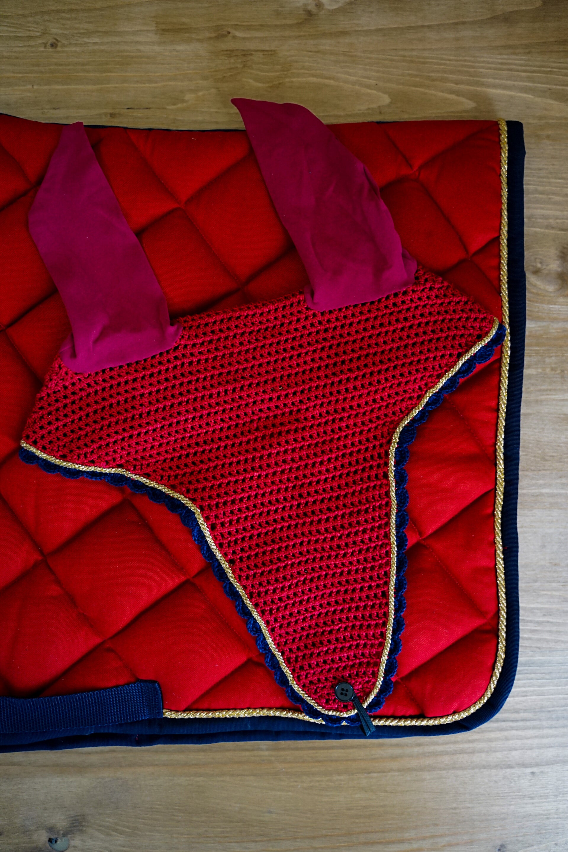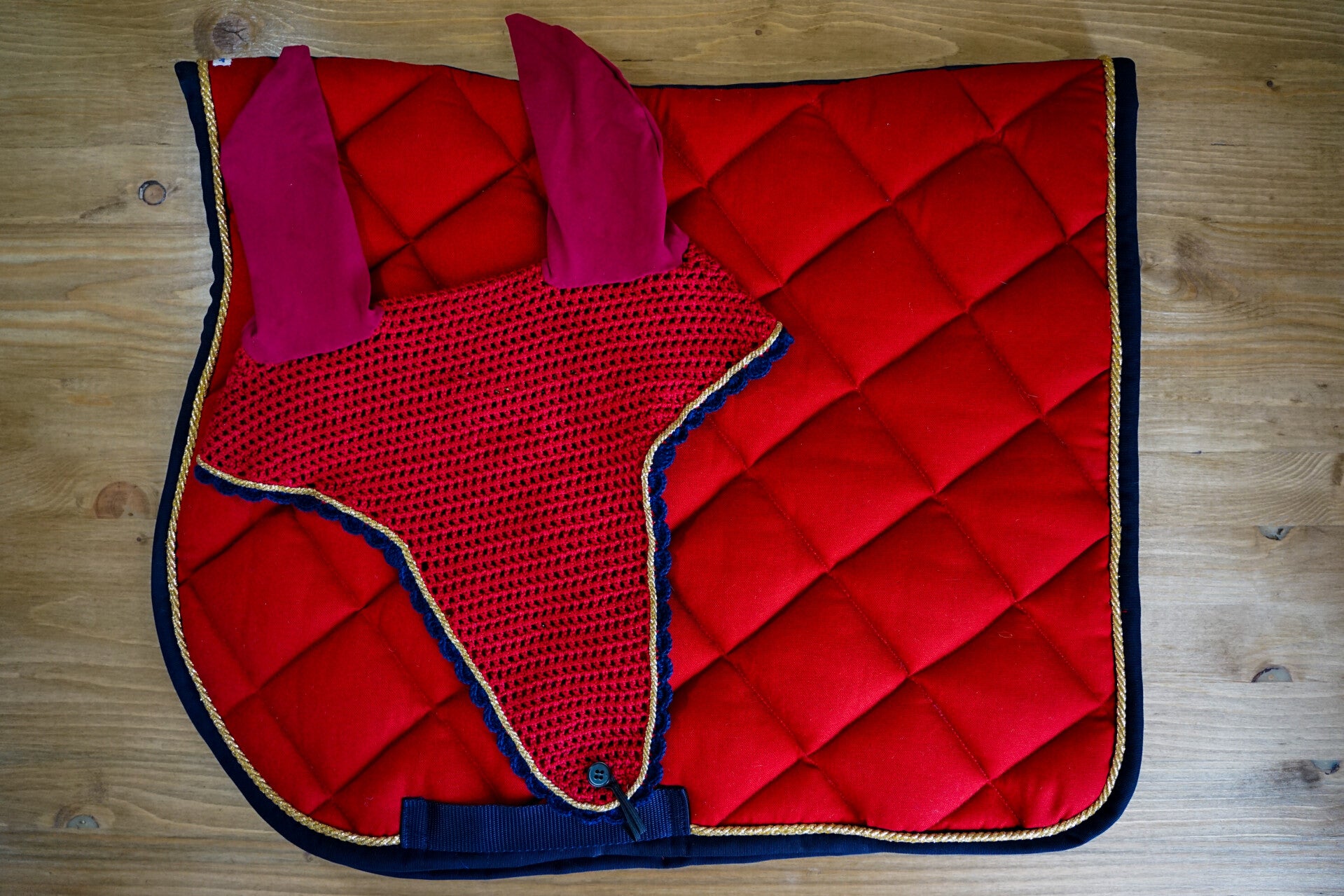 Sottosella e cuffietta lunga bordeaux con bordo blu notte e cordoncino oro. Interno in nido d'ape traspirante. Orecchie elasticizzate.