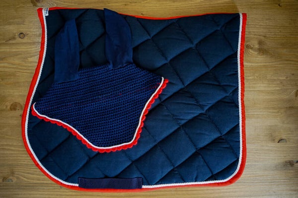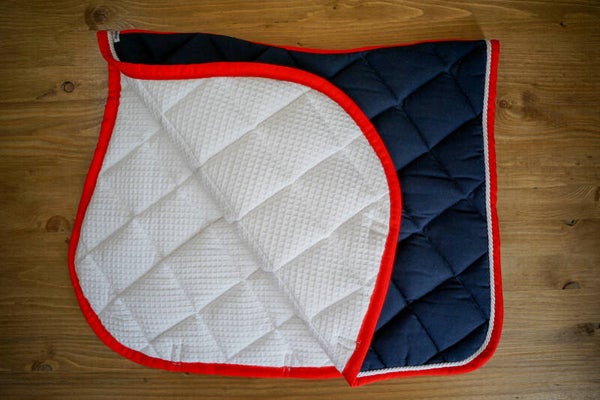 Sottosella e cuffietta corta blu notte con bordo rosso e cordoncino bianco. Interno in nido d'ape traspirante. Orecchie elasticizzate.