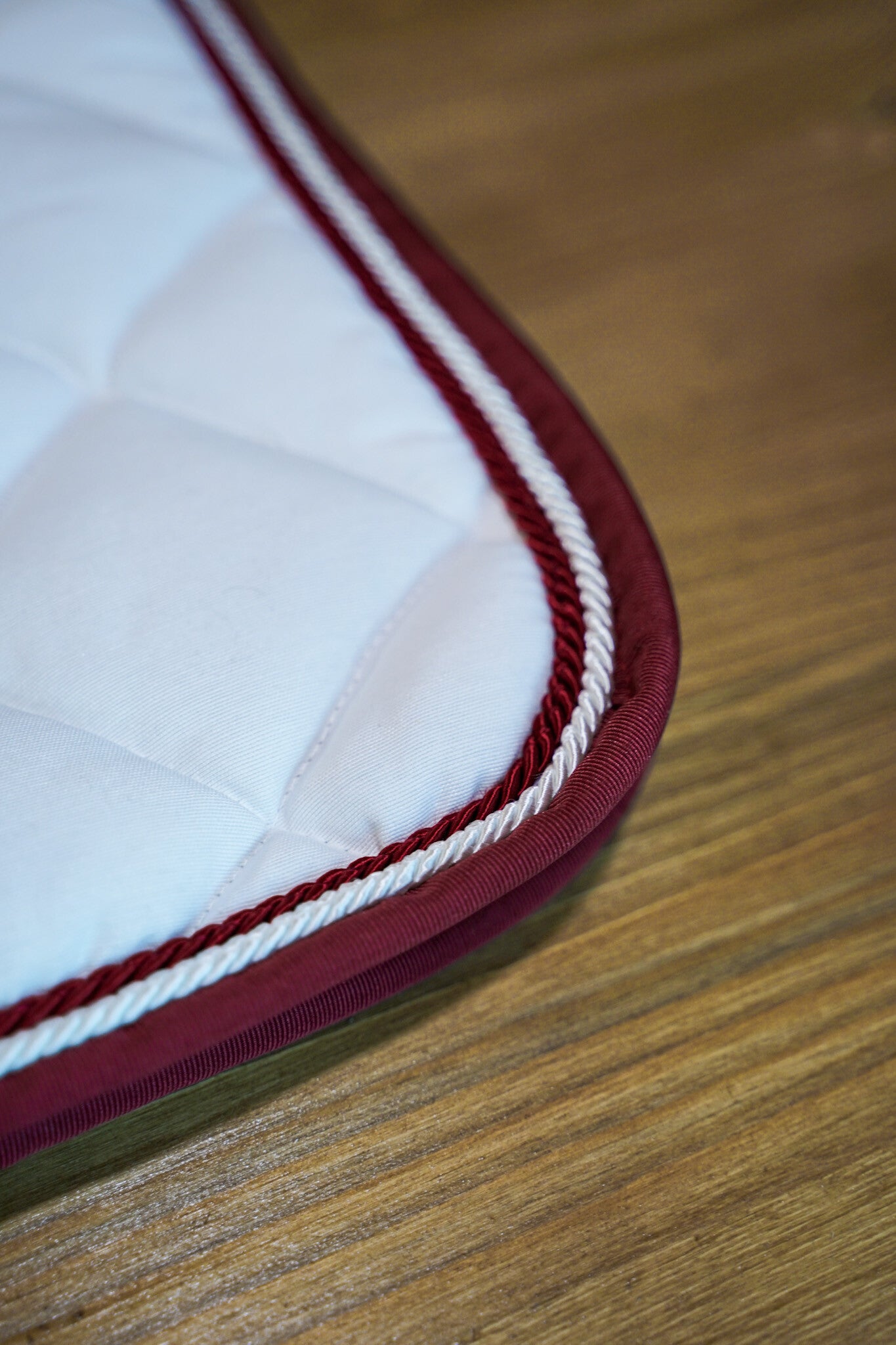 Sottosella bianco con bordo bordeaux e doppio cordoncino: bianco e bordeaux. Interno in nido d'ape traspirante.