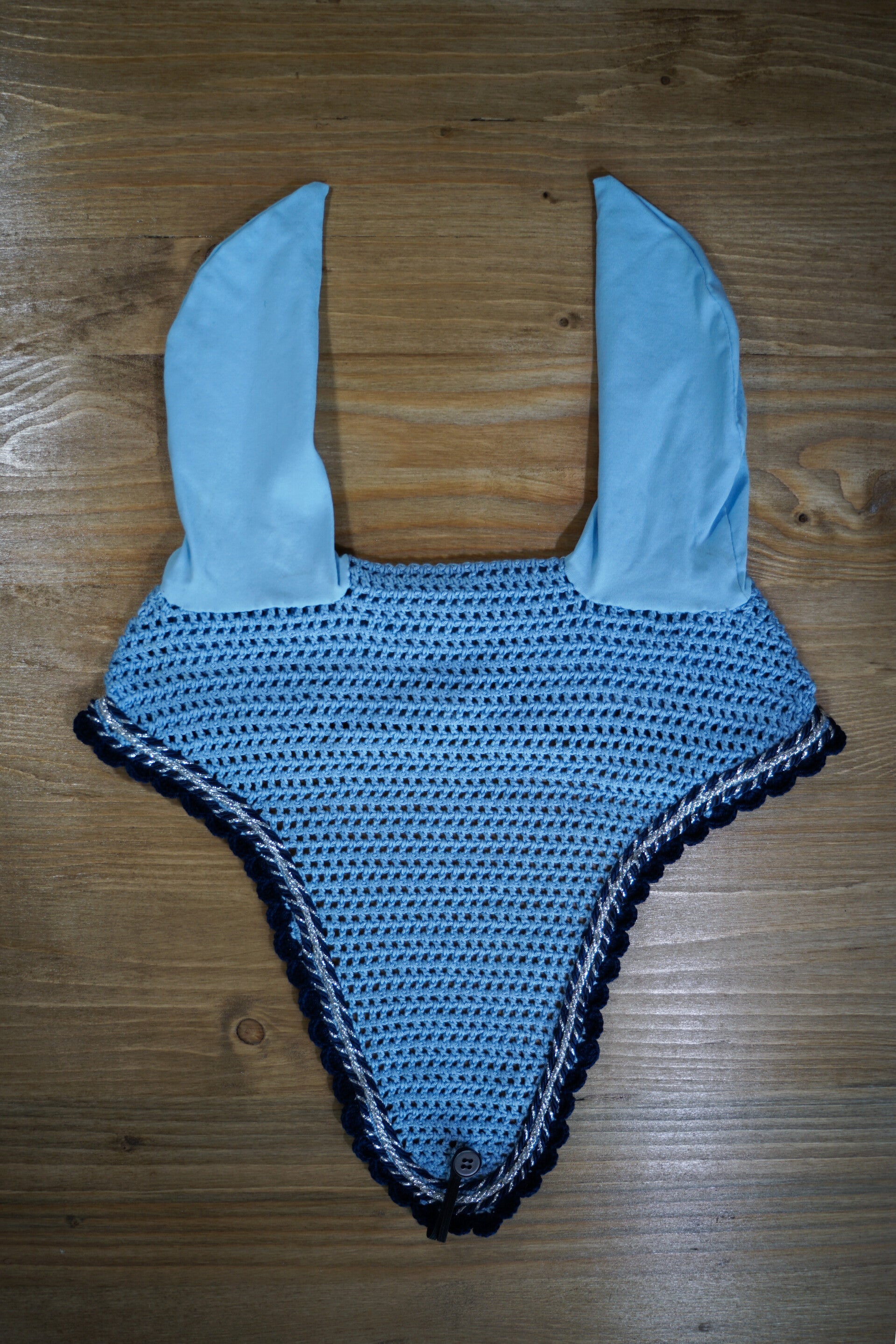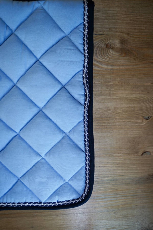 Sottosella e cuffietta lunga celeste con bordo blu notte e triplo cordoncino: due bicolore, blu e argento e uno argento. Interno in nido d'ape traspirante. Orecchie elasticizzate.