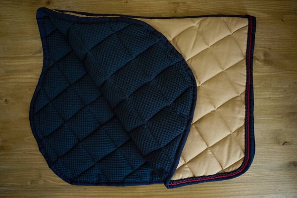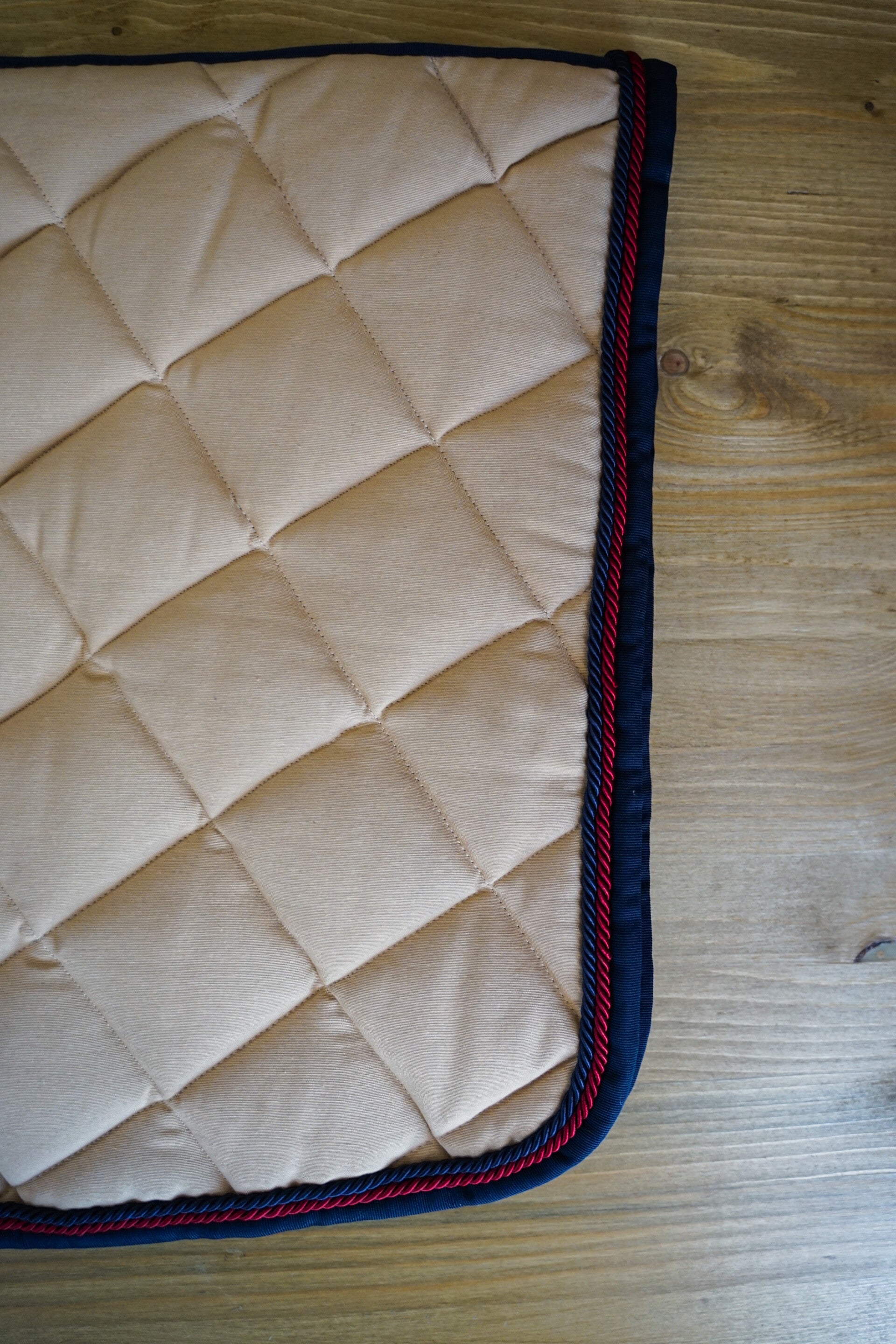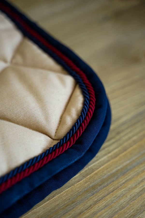 uSottosella e cuffietta corta beige con bordo blu notte e doppio cordoncino: blu notte e bordeaux. Interno in nido d'ape traspirante. Orecchie elasticizzate.