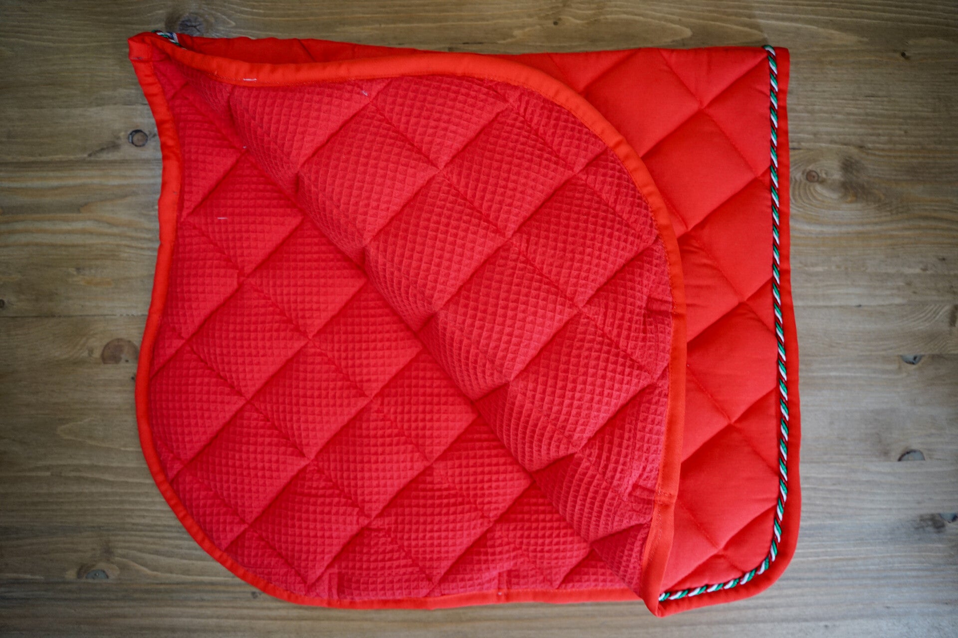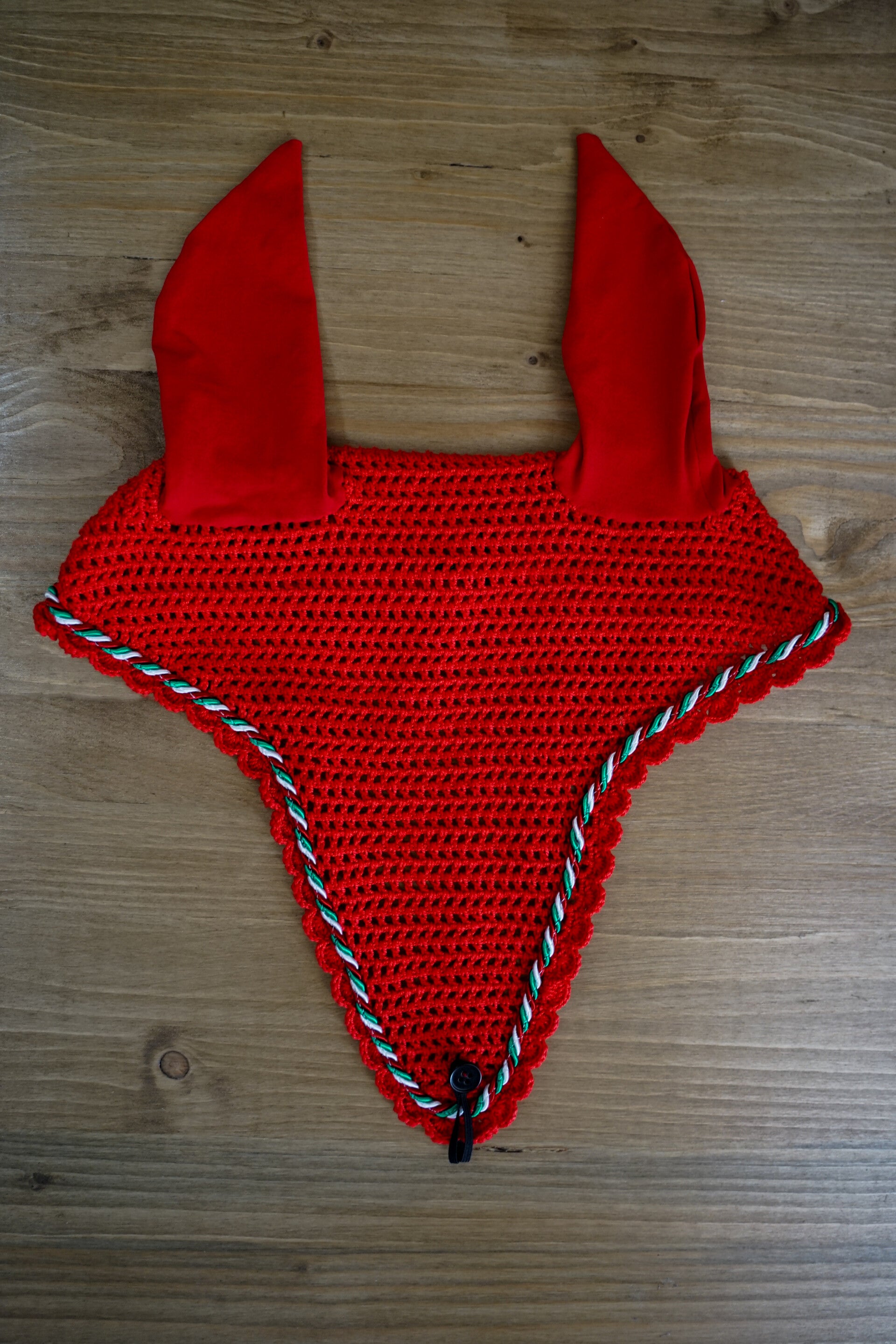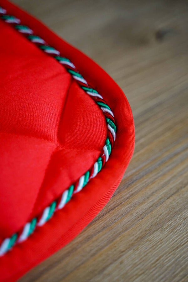 Sottosella e cuffietta lunga rossi con 1 cordoncino tricolore. Interno in nido d'ape traspirante. Orecchie elasticizzate.