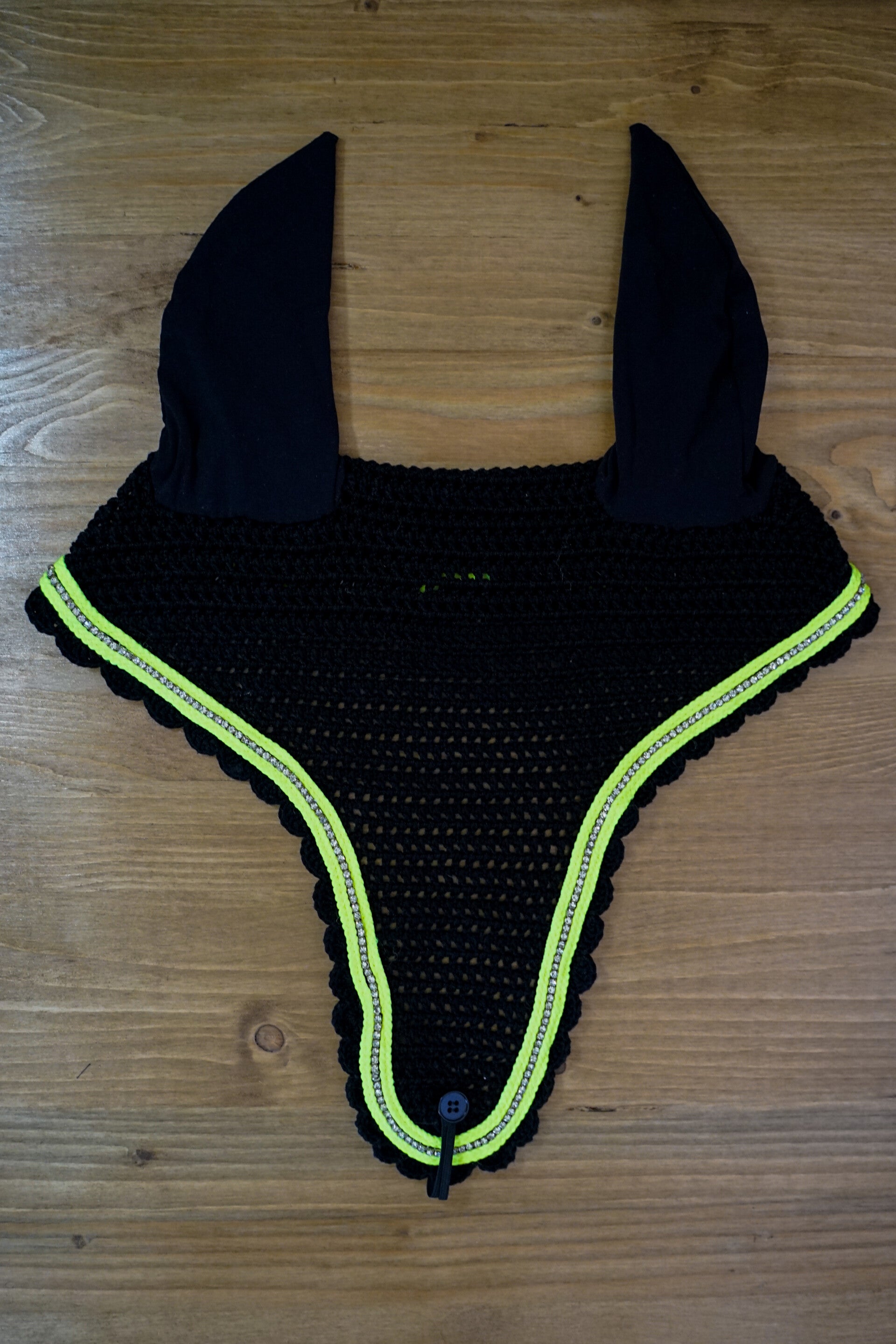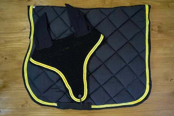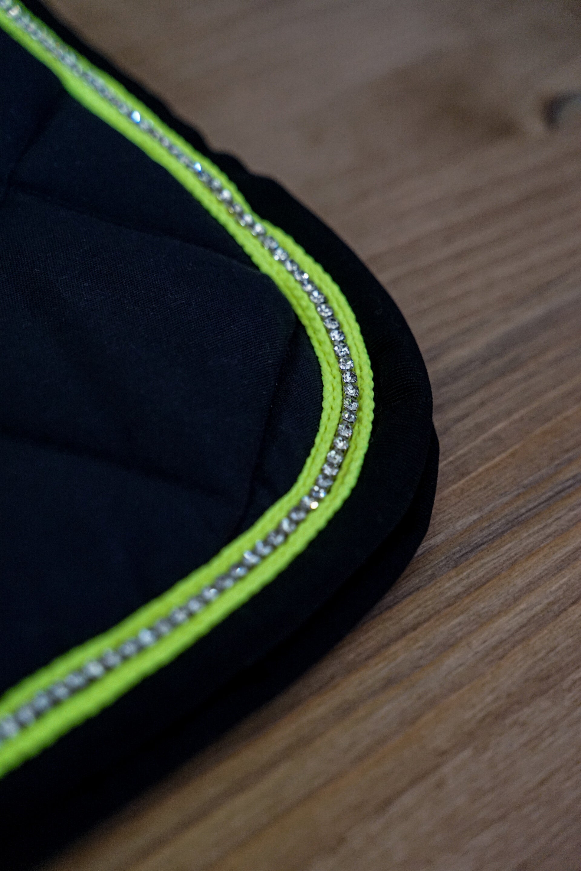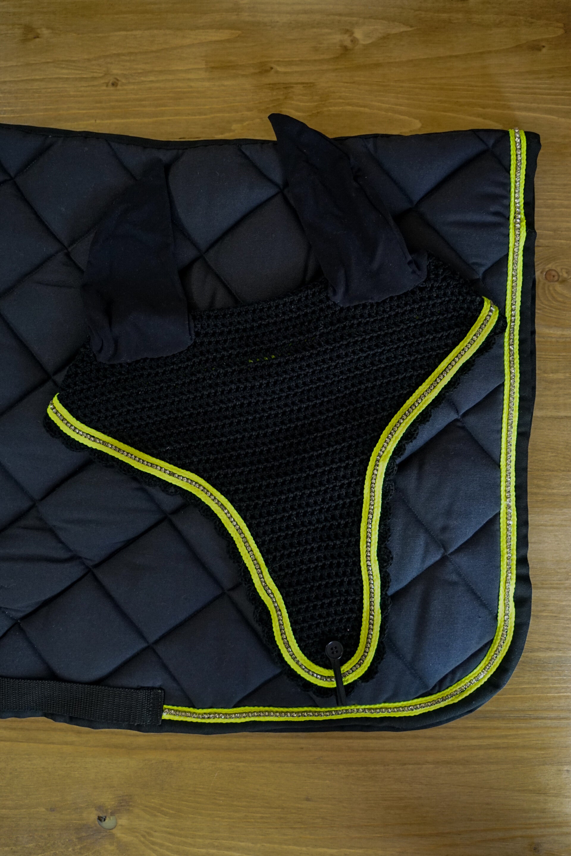 Sottosella in cotone nero con bordo nero, doppio cordoncino giallo fluo con una fila di strass. Interno in nido d'ape traspirante. Cuffietta lunga abbinata.