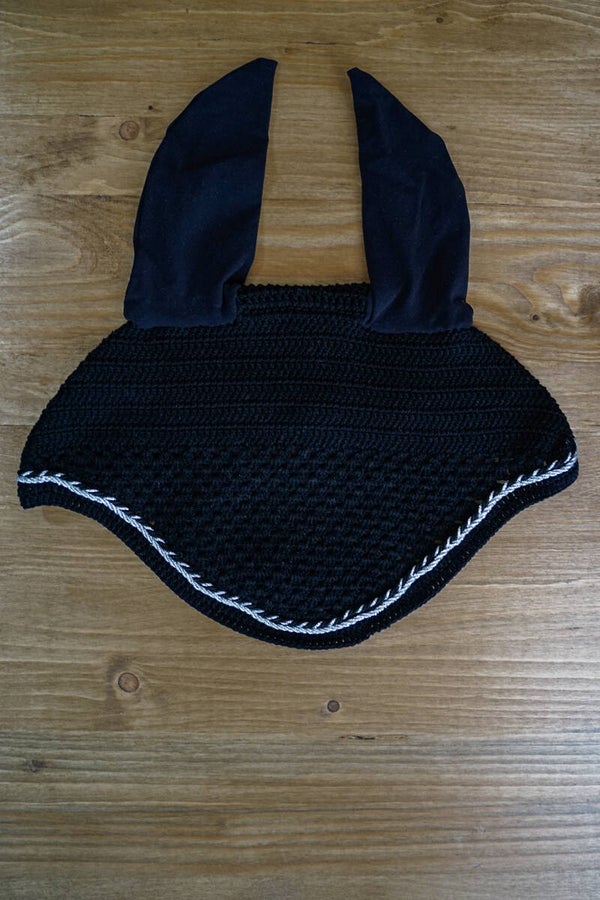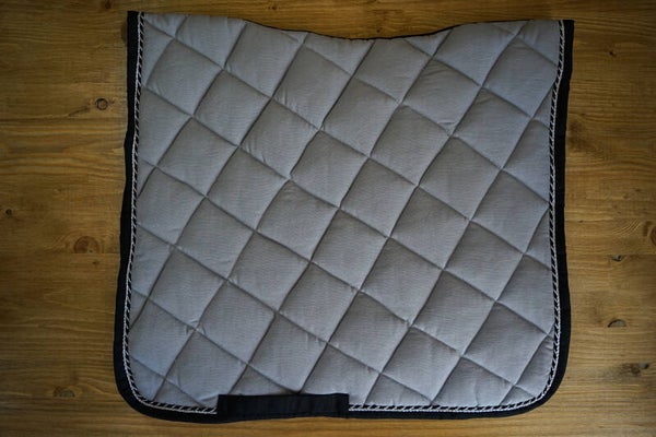 Sottosella da dressage in cotone grigio chiaro con bordo nero. Doppio cordoncino: nero argento ed argento: Interno in nido d'ape traspirante. Cuffietta corta abbinata con orecchie elasticizzate.