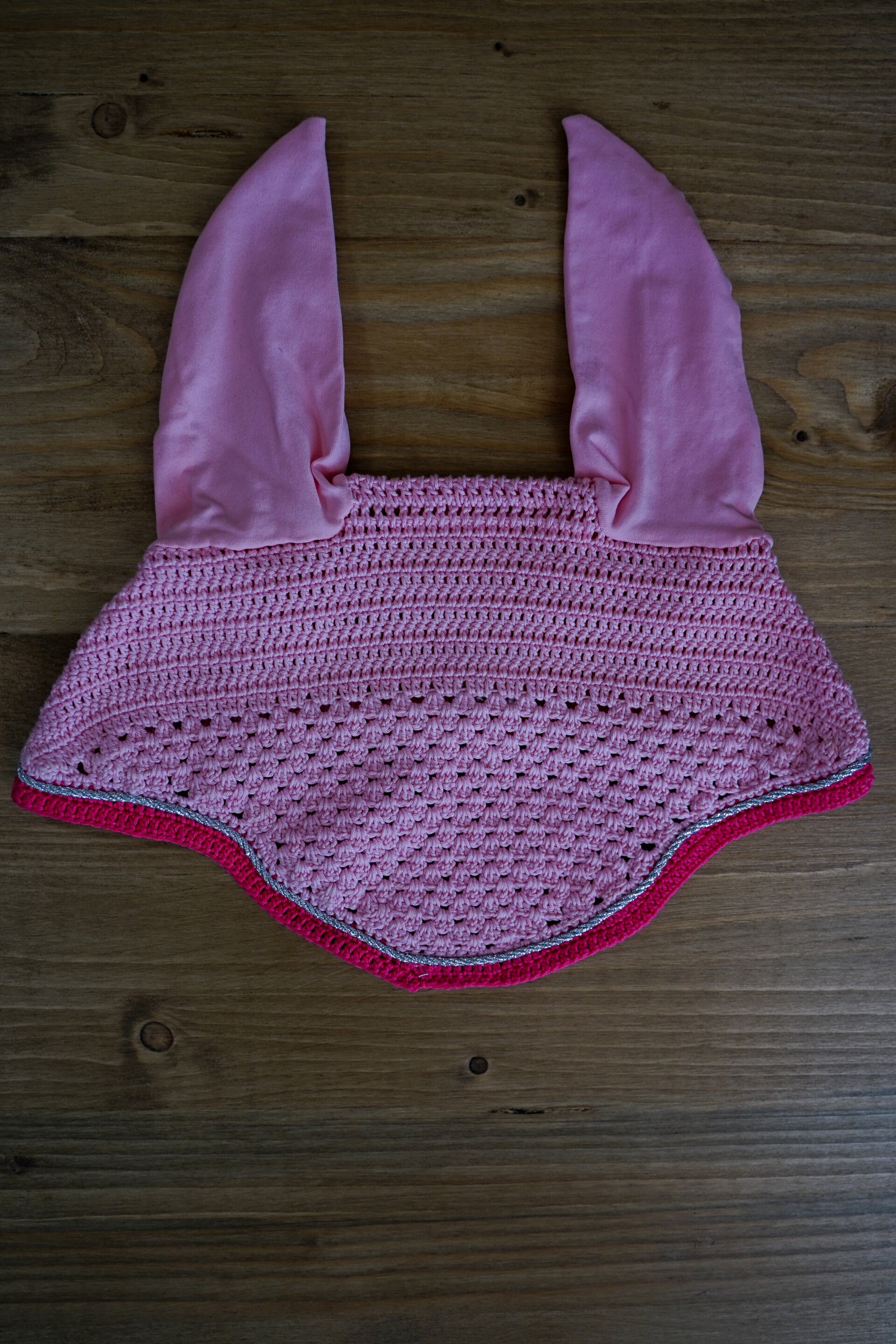 Cuffietta in cotone rosa con orecchie elasticizzate rosa con 1 cordoncino argento e bordo fucsia.
